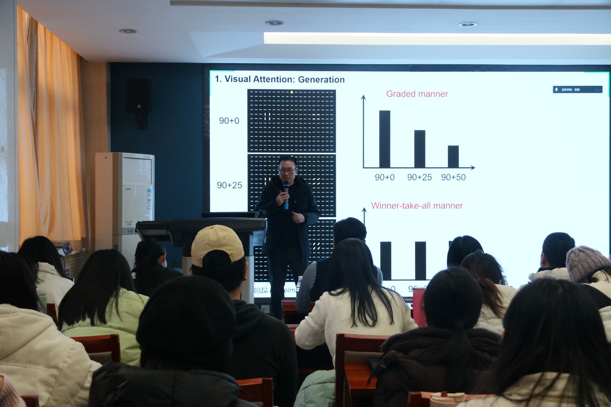 张喜淋教授围绕视觉注意的产生机制、功能特性、计算模型及其在临床和亚临床研究中的应用进行了系统论述。他介绍了视觉注意在复杂环境中完成信息筛选与资源分配的核心作用,涉及显著性提取、前景背景分离、干扰过滤等多个加工环节。接着,张教授结合大量行为实验与脑成像证据,讨论了注意的功能,说明了特征注意与类别注意的扩散效应。当个体关注某一特征时,与之相关的刺激即使不在注意焦点内,也会获得增强的神经表征。这一现象揭示了额顶网络与感觉皮层间的重要交互机制,并为理解视觉搜索与目标识别提供了关键证据。随后,张教授介绍了团队基于行为数据和神经机制构建的多类模型框架,用于解释“中心增强—周围抑制”模式及期望(expectation)对神经元调谐特性的影响。他指出,预测编码视角能够更好地解释大脑如何在有限容量下进行信息优化。相关研究还通过人工神经网络的消融分析揭示预测单元与误差信号在注意调控中的重要作用,为连接生物神经机制与深度学习模型提供了新思路。